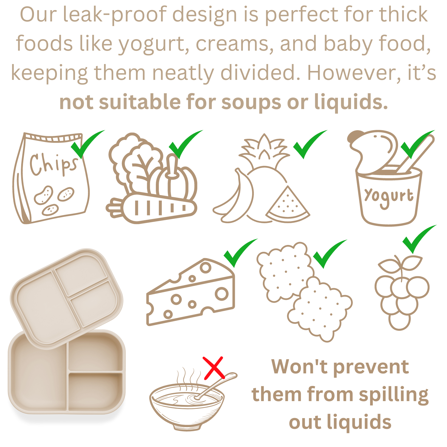 Designed to provide healthy, on-the-go meals for both you and your little one, this travel essential bento box features three compartments to easily separate and portion out your favorite foods. The leakproof design ensures your meals stay fresh and mess-free, while the flexible silicone material makes it a breeze to clean. Perfect for school lunches, traveling, daycare & more! Also ideal for adults who enjoy small, well-portioned meals or snacks.