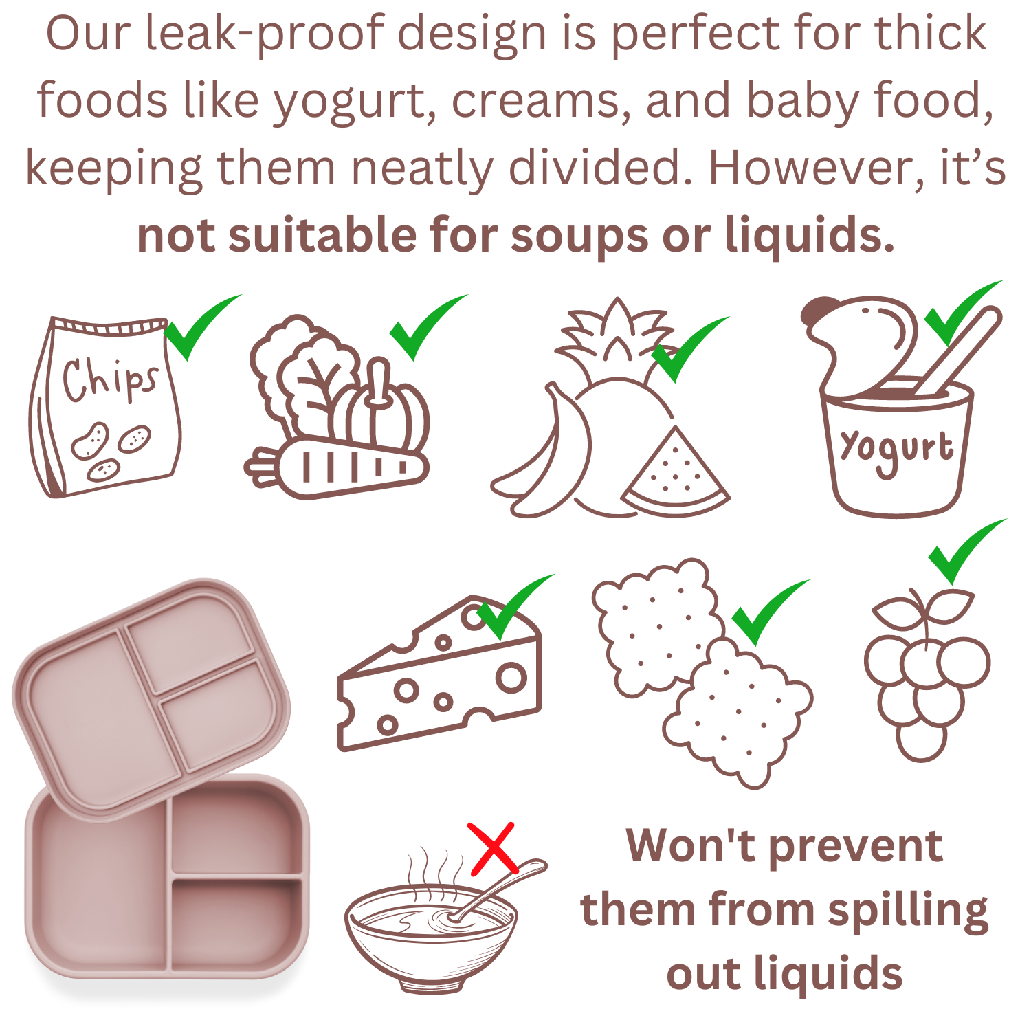 Designed to provide healthy, on-the-go meals for both you and your little one, this travel essential bento box features three compartments to easily separate and portion out your favorite foods. The leakproof design ensures your meals stay fresh and mess-free, while the flexible silicone material makes it a breeze to clean. Perfect for school lunches, traveling, daycare & more! Also ideal for adults who enjoy small, well-portioned meals or snacks.