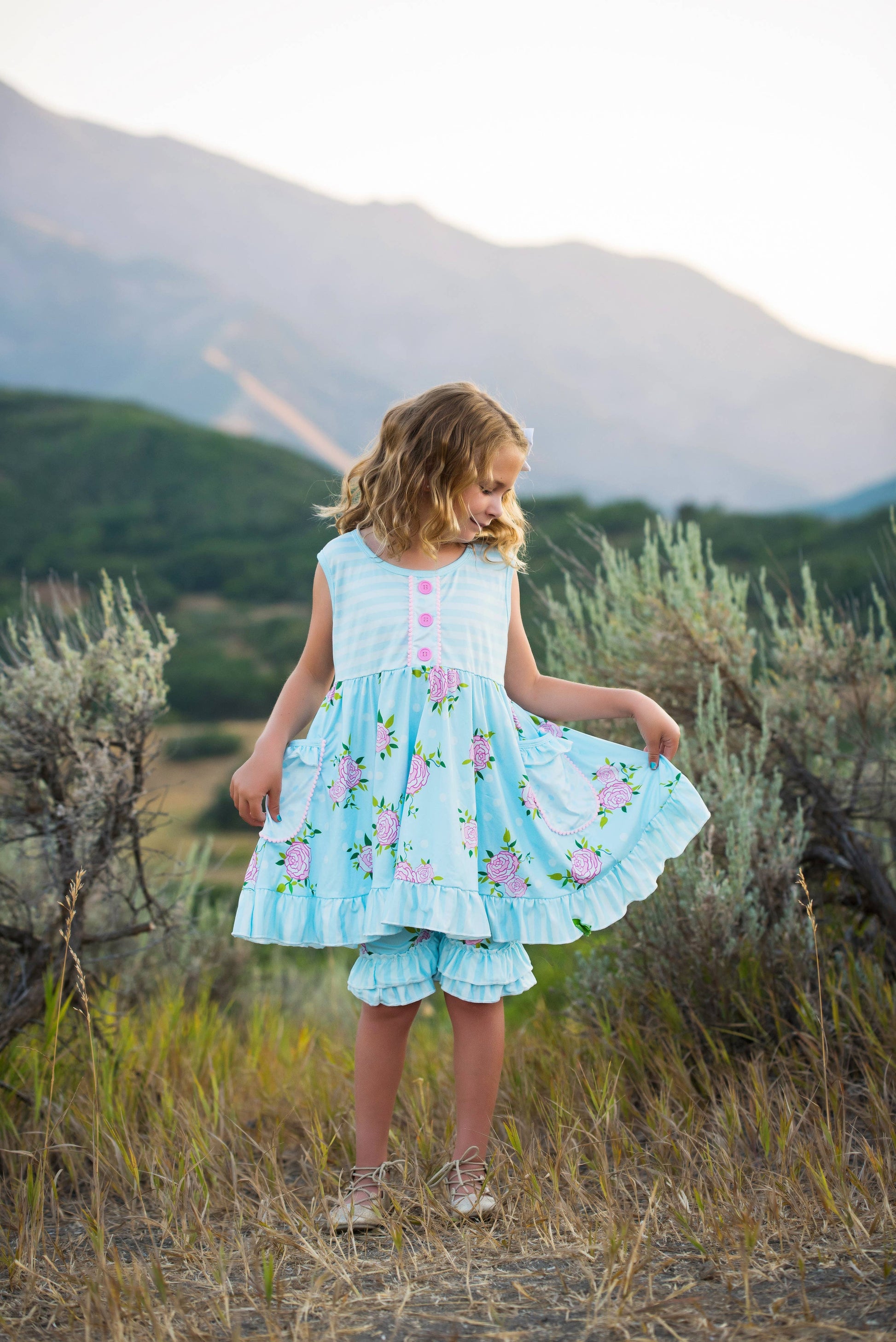Add a touch of playful charm to her wardrobe with our Light Blue Ruffle Short Set. This adorable set features a floral polka dot striped tunic top with pockets, complemented by lace and button accents. The long floral shorts with double ruffles add a fun flair, making it the perfect outfit for spring and summer fun.