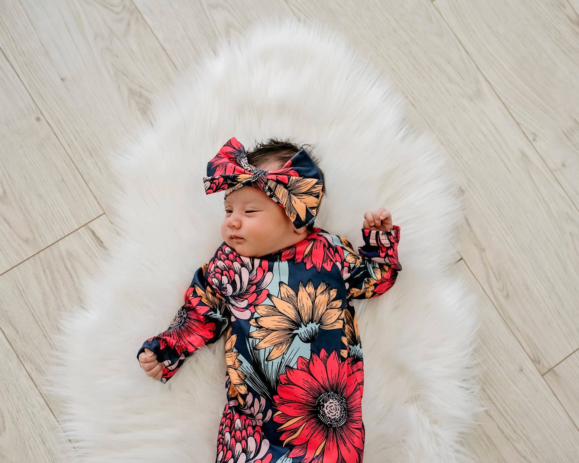 Includes a free matching headband! Enjoy this adorable navy & coral sunflower print sleep gown for your precious new arrival. Our gowns are made of a quality 95% polyester and 5% spandex blend that leaves your babe feeling super soft & incredibly cozy. The sturdy elastic at the bottom allows parents quick access for diaper changes and will keep little toes tucked in during all hours of the day and night. Fits 0-3M