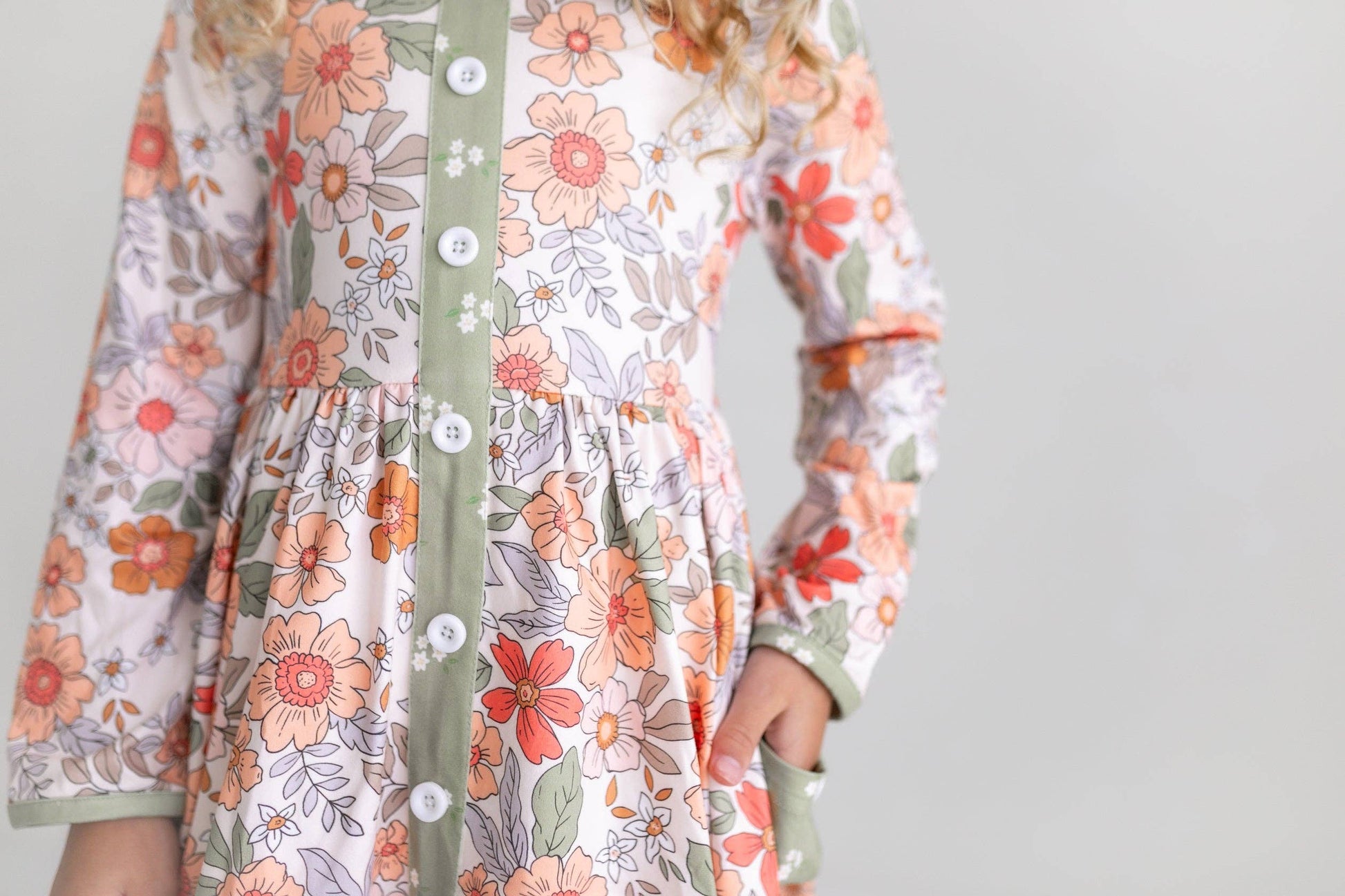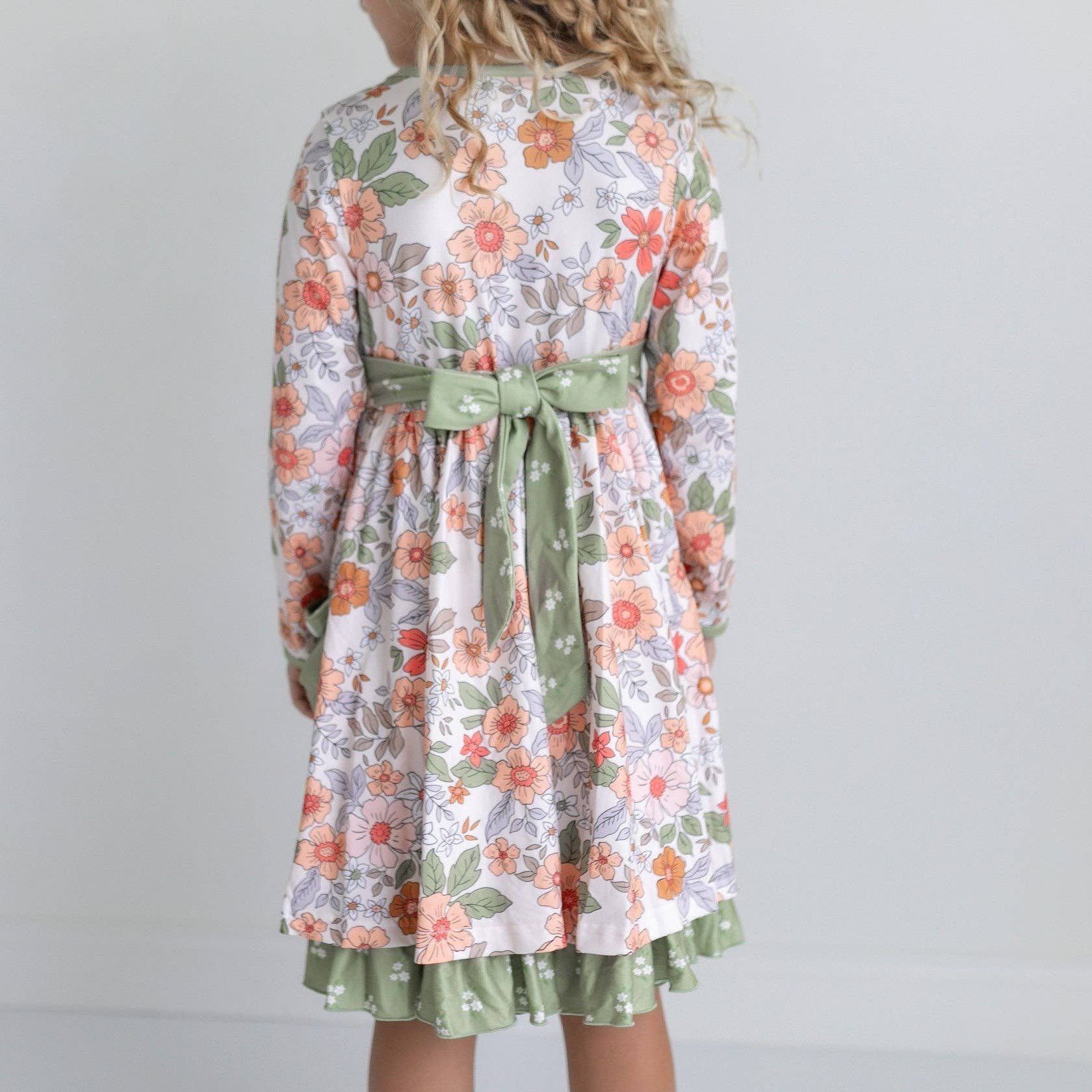 Girls sage, white, and rust vintage fall floral print pocket dress with ruffle and button details. Long sleeve dress ties in the back. So cute for back to school in the fall!