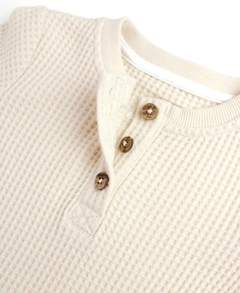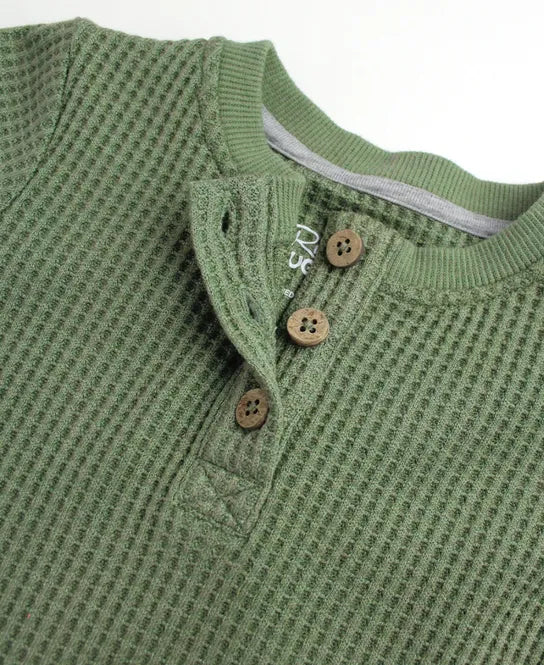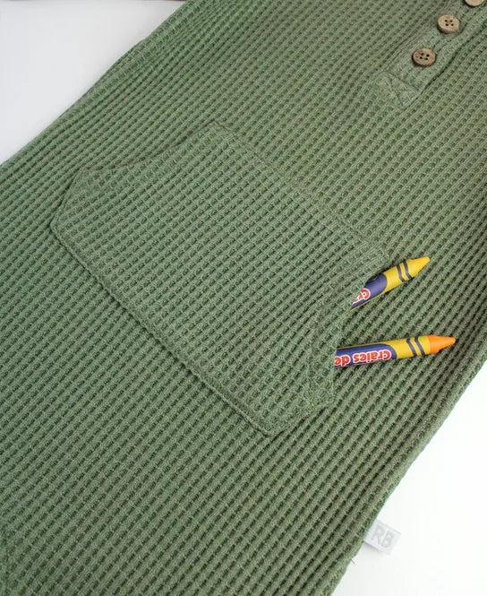 Crafted from ultra-soft and cozy waffle knit fabric, this romper features a stylish henley neckline and easy snap closures for effortless dressing and diaper changes. Perfect for newborns, it offers warmth and flexibility, making it an adorable choice for everyday wear or special occasions.